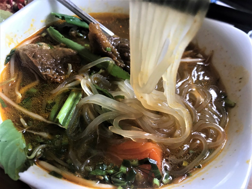 Bún bò Huế is another beef noodle soup, with rice noodles typically thicker and rounder than in phở. Originating from the ancient Vietnamese royal capital of Huế, on the central coast, its salt and spice are balanced by a strong flavor of lemongrass, boiled with bones and beef shank. It may be seasoned with fermented shrimp sauce, sugar and chili oil. The best bún bò includes sliced beef along with oxtail and pig’s knuckles.