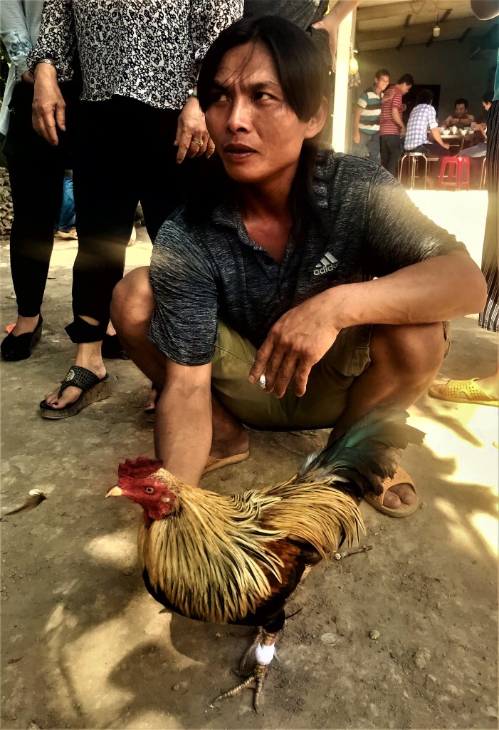 Cockfighting is a traditional if brutal sport that has been banned by the Vietnamese government. Its illegal status, however, doesn’t dissuade devotees from pursuing their passion. A lot of money is gambled when the roosters are wrestling, and many men have lost a small fortune in the chicken ring.