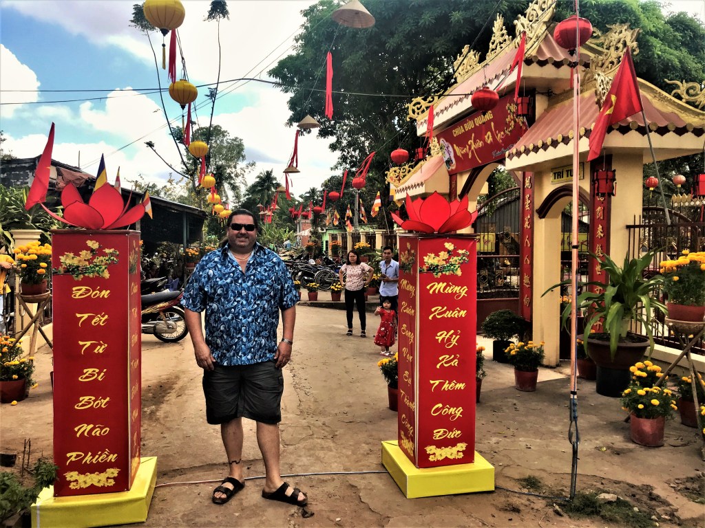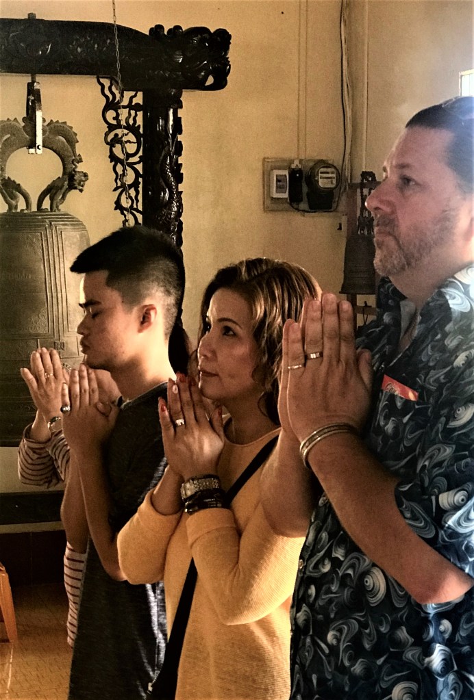 A padded gong gently announced our arrival to a young priest, whose face lit into a broad smile as Kurt and Thi approached. Kurt embraced his wife’s Buddhist faith when they were married. His annual returns to his wife’s hometown are met with anticipation not only by the immediate family, but by the greater Quới Ân community, as well. (I had already grown accustomed to him wishing “Chúc Mừng Năm Mới,” “Happy New Year,” to everyone we passed as we walked.)