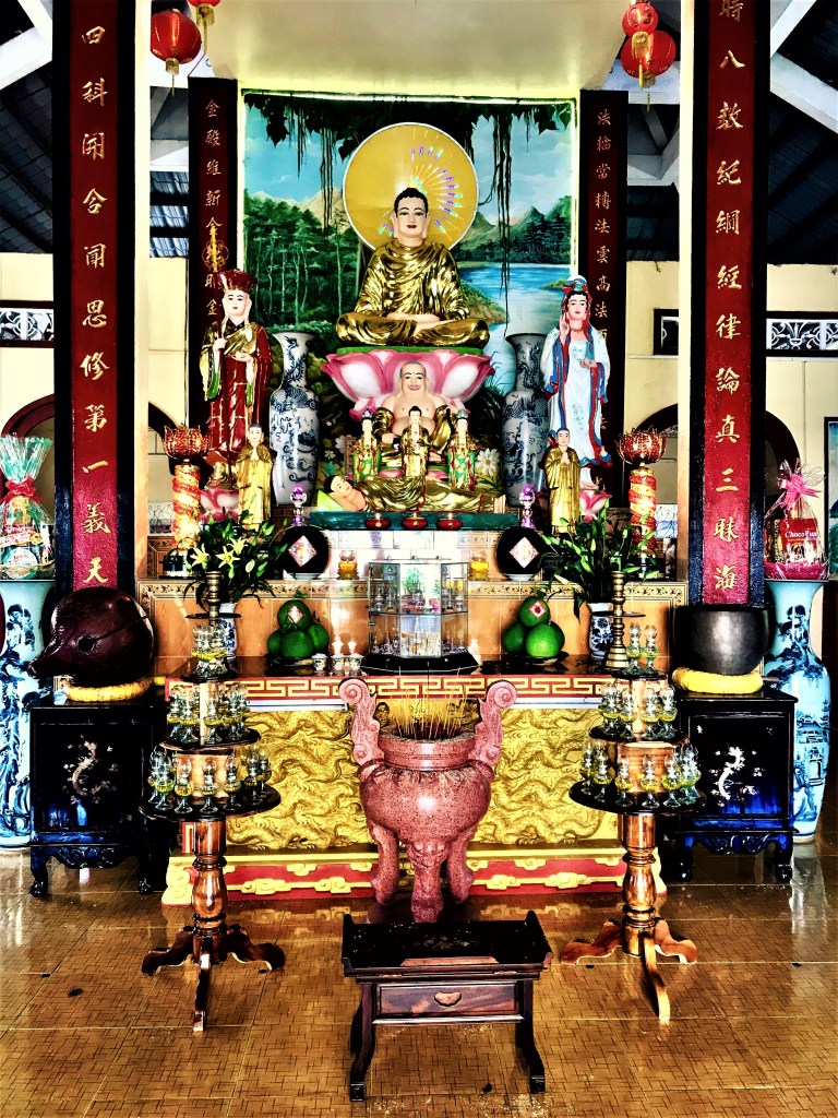 Offerings of fruit, flowers and incense adorned altars to the Sakyamuni Buddha, often protected by icons of fierce warriors. The many-armed goddess of mercy, Quan Am, had a central place of respect. Against one wall stood an antique bronze bell, its bench and hammer confirming that it was often in use.
