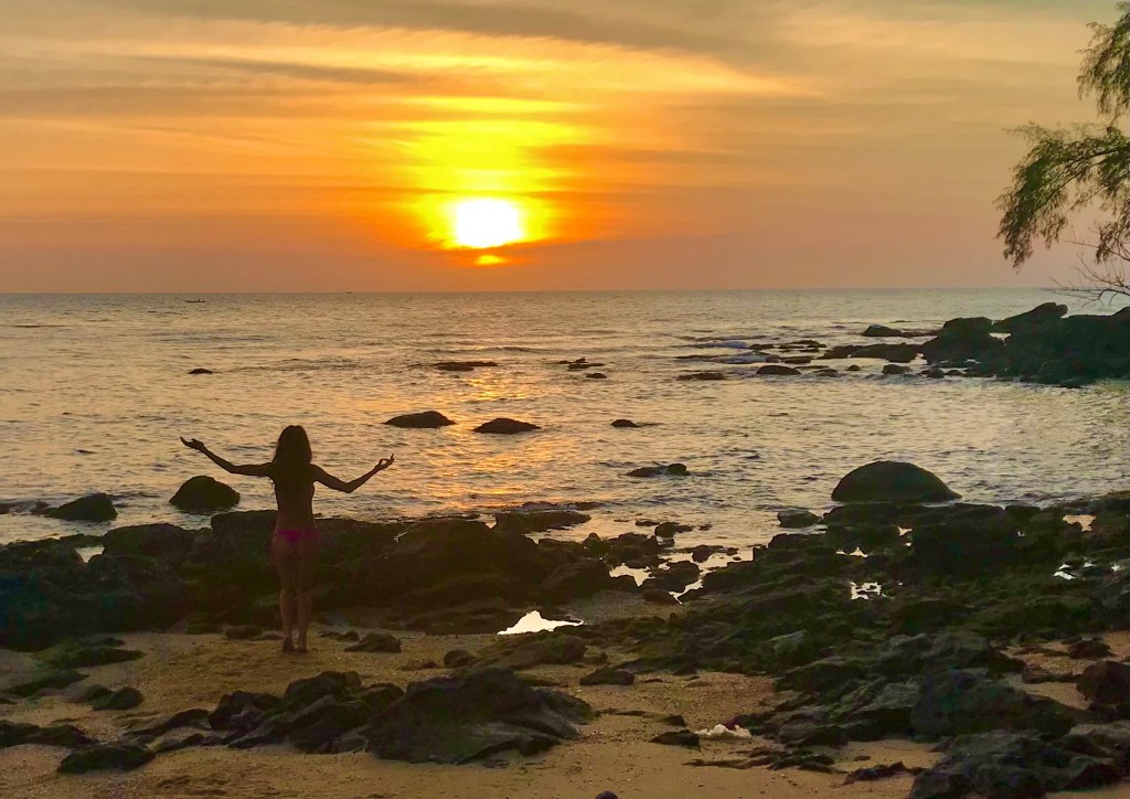 The long sandy beach, better known to locals than tourists, has a view down the Gulf of Thailand coast to the fishing pier at Dương Đông town, 6 km (3.8 miles) south. (If you missed my first Phu Quoc blog, you can read it here.) At its north end, the willowy needles of ironwood trees drift and land upon a rocky point where young children pursue tiny crabs skittering through tidepools, as their caretakers salute the setting sun with graceful twilight dances.