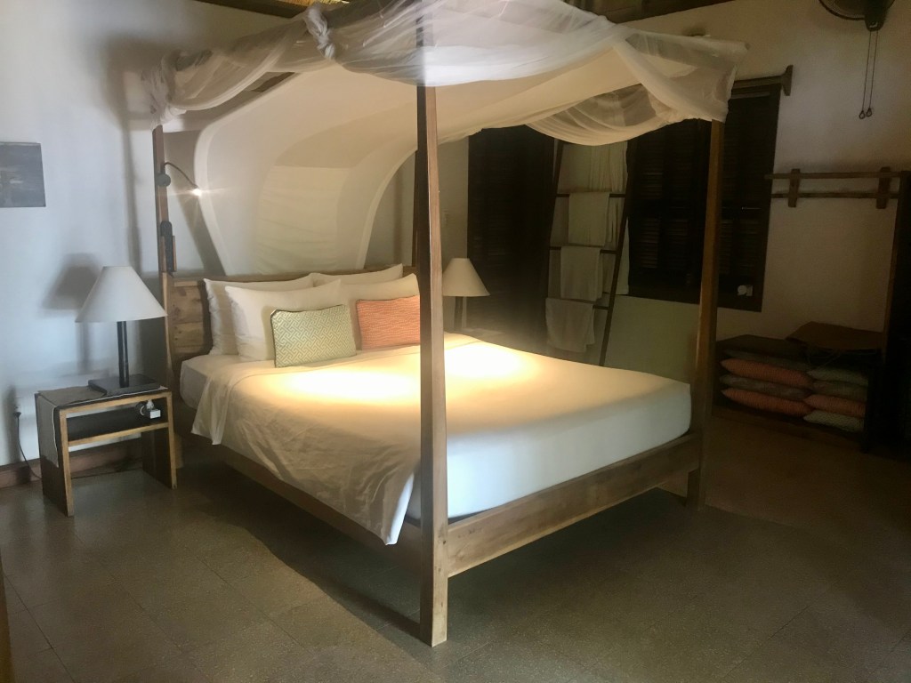 Ong Lan’s brand of luxury is more my style. The Mango Bay Resort conceals 44 bungalows and other guest rooms in a frangipani-scented forest that slopes gently to the beach. The design reflects the architects’ commitment to conservation and environmental sustainability. Solar panels provide much of the energy. There is no air-conditioning, no television, no wifi in the rooms. Off-site parking and shuttle vehicles assure traffic-free relaxation.