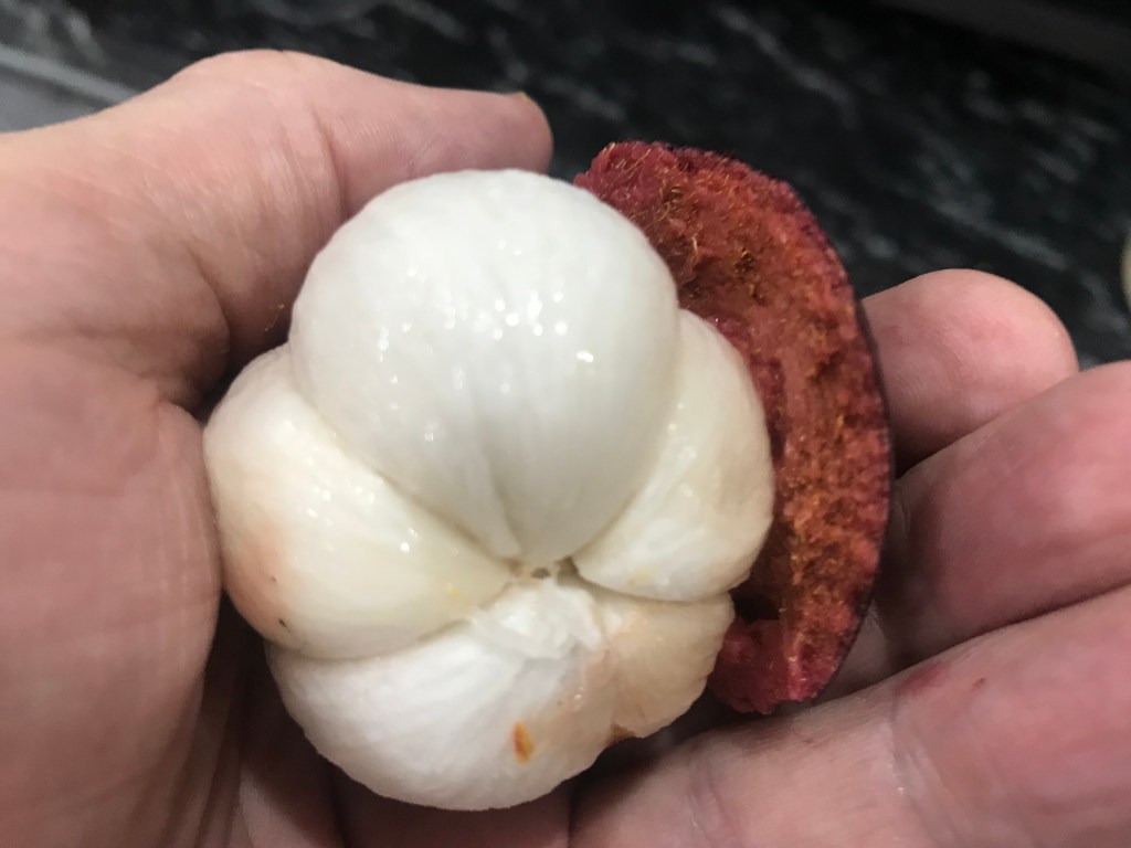 The mangosteen, no relation to the mango, will also leave a permanent purple stain on your best T-shirt. That’s from the thick rind, so even though you may be impatient to taste the fruit, be careful as you prepare to devour it.