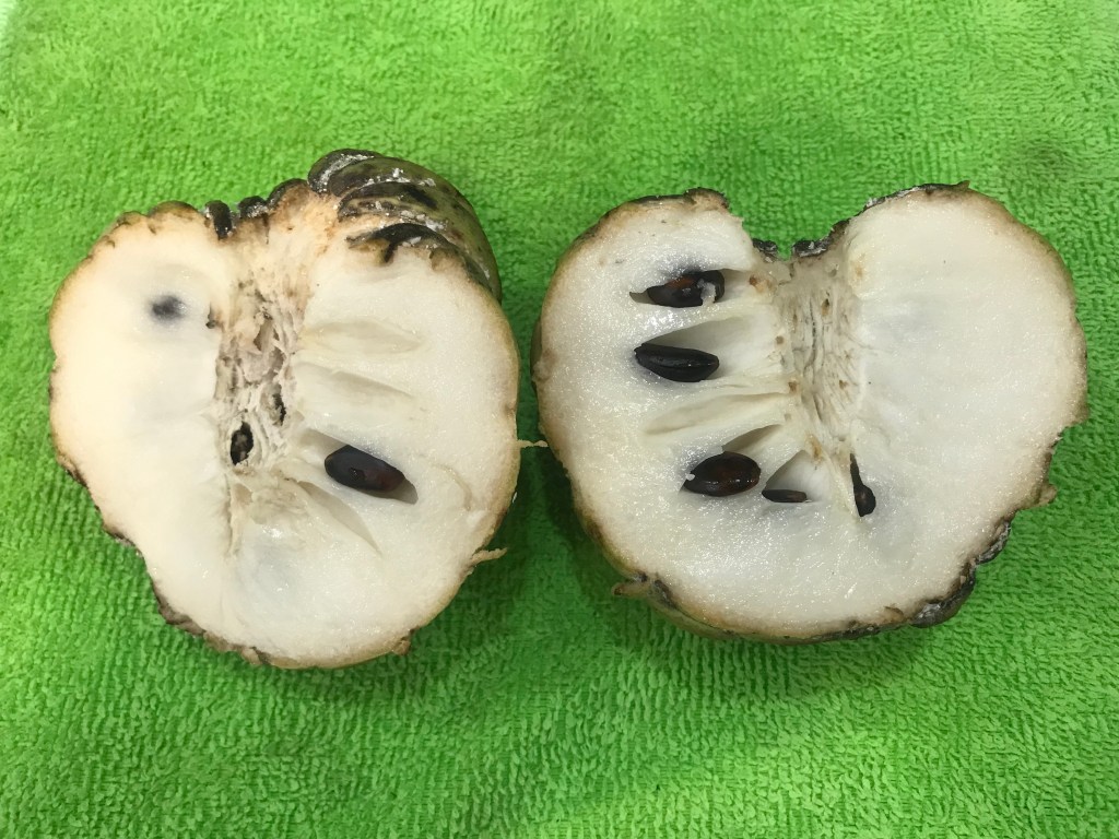Inside, the white flesh is sweet and creamy, with a custard-like flavor. There may be two to three dozen hard, black seeds immersed in the pulp; standard practice is to spit them out as you eat.