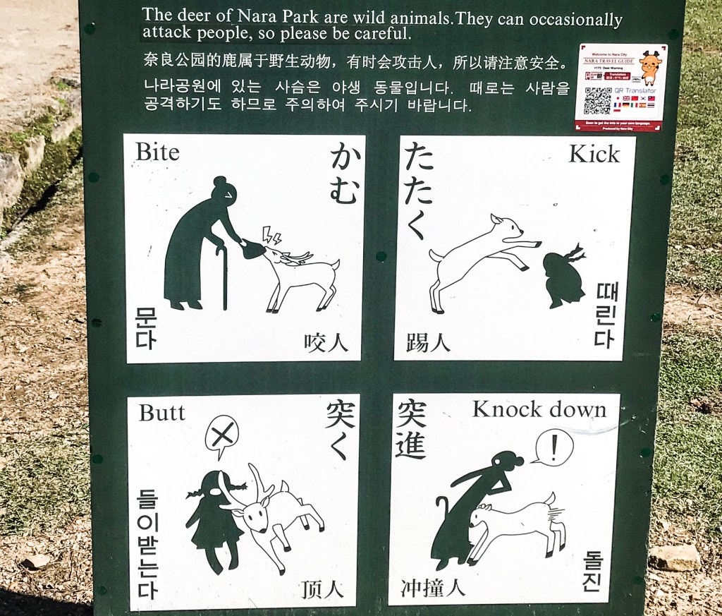Vendors sell sika-senbei (“deer crackers”) for visitors to feed the deer. It is said that some deer have learned to bow to receive these offerings. But they can also be dangerous: More than 100 tourists a year are injured by the animals’ hooves or spike-like antlers, and multilingual signs now advise caution.