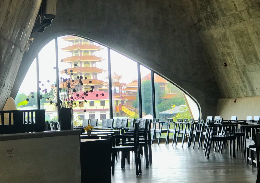 The Trung Nguyen museum cafe has a window that looks upon a colorful Buddhist pagoda. (JGA photo)