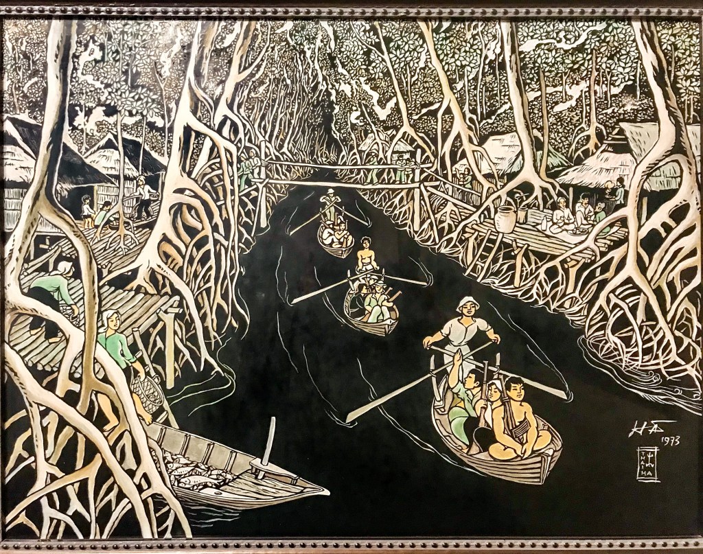 “Ca Mau Guerillas” by Thai Ha (1922-2005), in the Fine Arts Museum, depicts soldiers traveling past villagers in a mangrove forest.