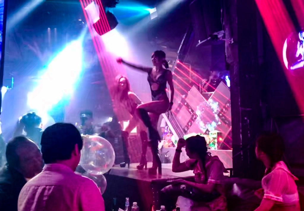 As búsinessmen enjoy nitrous-oxide balloons, dancers take the stage at the Crazy Girls nightclub on Bui Vien street. (JGA photo)