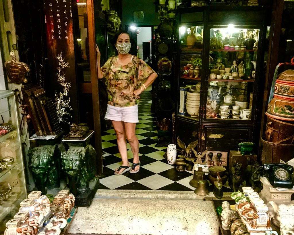 An antiques dealer on Le Cong Kieu exhibits some of her merchandise to a passer-by. (JGA photo)